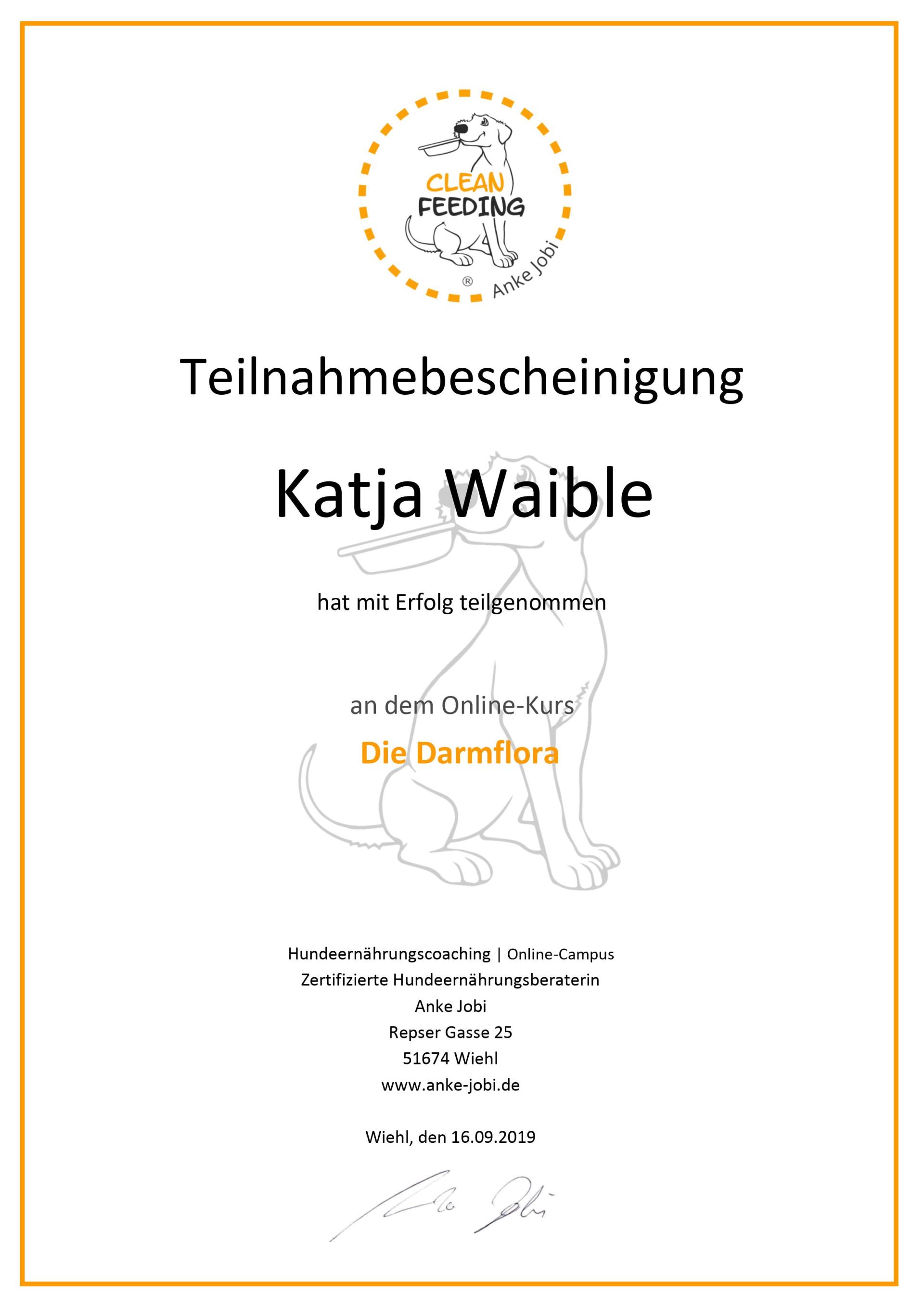 Um mein Wissen zu erweitern habe ich den Lehrgang Ernährung von Hunden und Katzen an der ATN (Akademie für Tiernaturheilkunde, ISO 9001-2015-zertifiziert) abgeschlossen. Zusätzlich habe ich mich an der Dogtisch Academy und bei Cleanfeeding im Bereich BARF und spezielle Ernährung bei Erkrankungen weitergebildet.