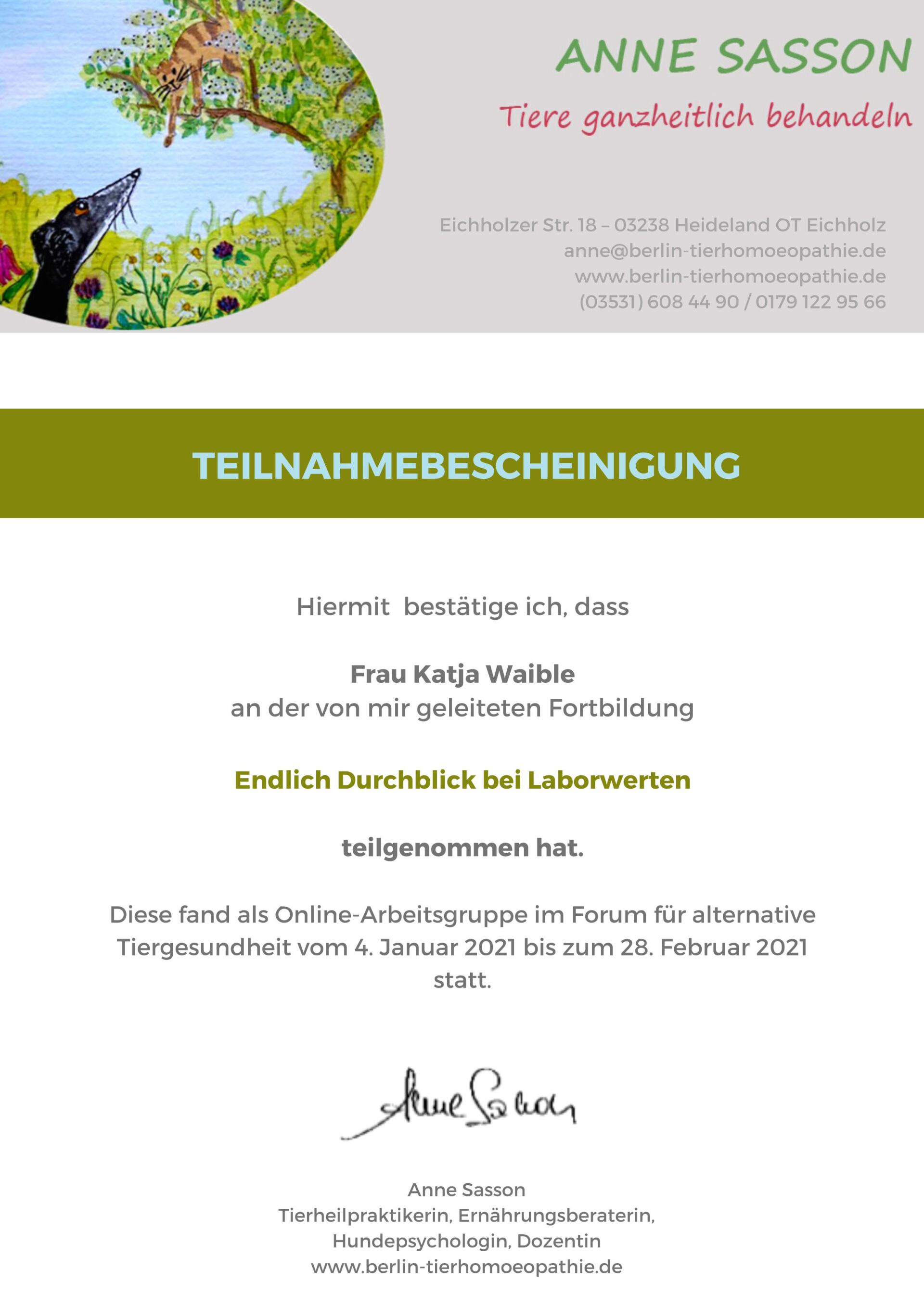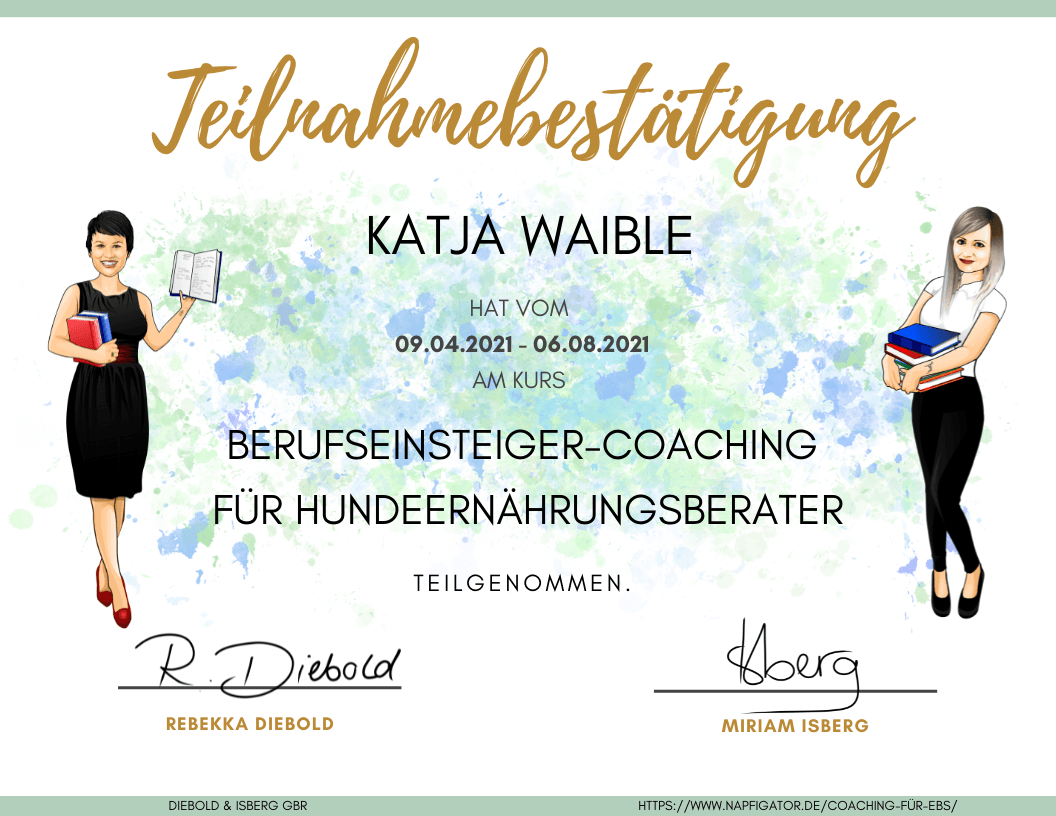 Um mein Wissen zu erweitern habe ich den Lehrgang Ernährung von Hunden und Katzen an der ATN (Akademie für Tiernaturheilkunde, ISO 9001-2015-zertifiziert) abgeschlossen. Zusätzlich habe ich mich an der Dogtisch Academy und bei Cleanfeeding im Bereich BARF und spezielle Ernährung bei Erkrankungen weitergebildet.